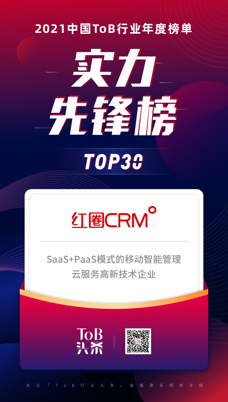 12月27日,「ToB行業頭條」聯手3W集團正式發布了《2021ToB行業年度榜單·實力先鋒榜》,評選出了2021年ToB領域各賽道最具實力的先鋒企業TOP30。“和創科技(紅圈CRM)”作為數字化智能企業云服務領域的先鋒企業,入選榜單行列!