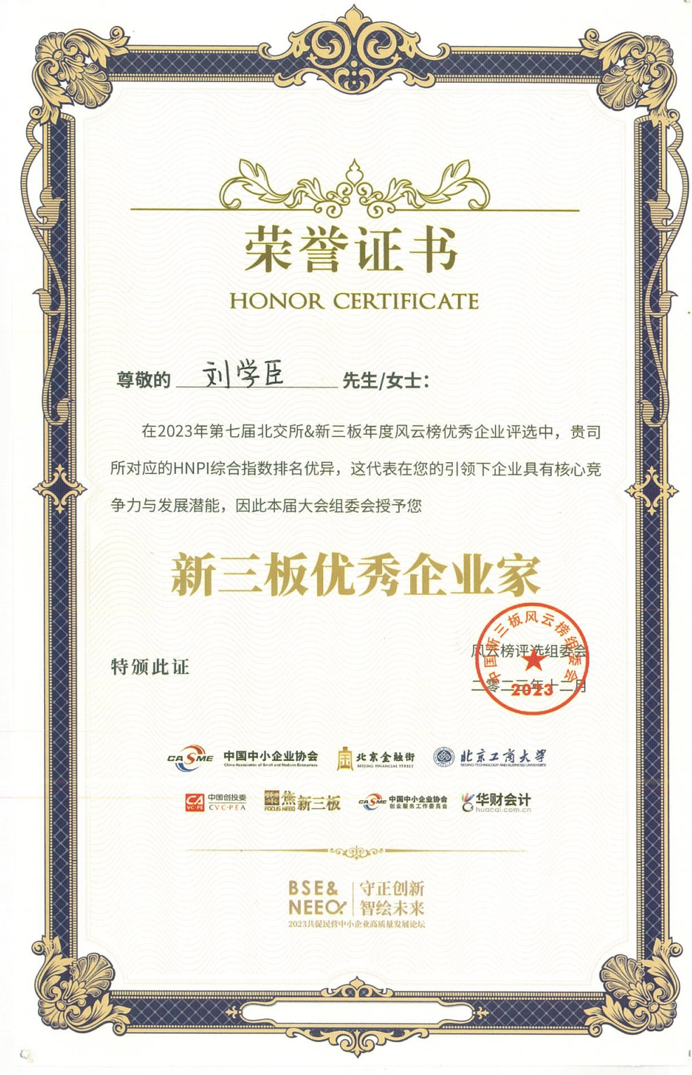 經由北交所及新三板投資者保護指數綜合評選,和創科技榮獲第七屆北交所&新三板年度風云榜盛典“新三板最具投資價值企業”,和創科技創始人/總經理劉學臣被評為“新三板優秀企業家”。