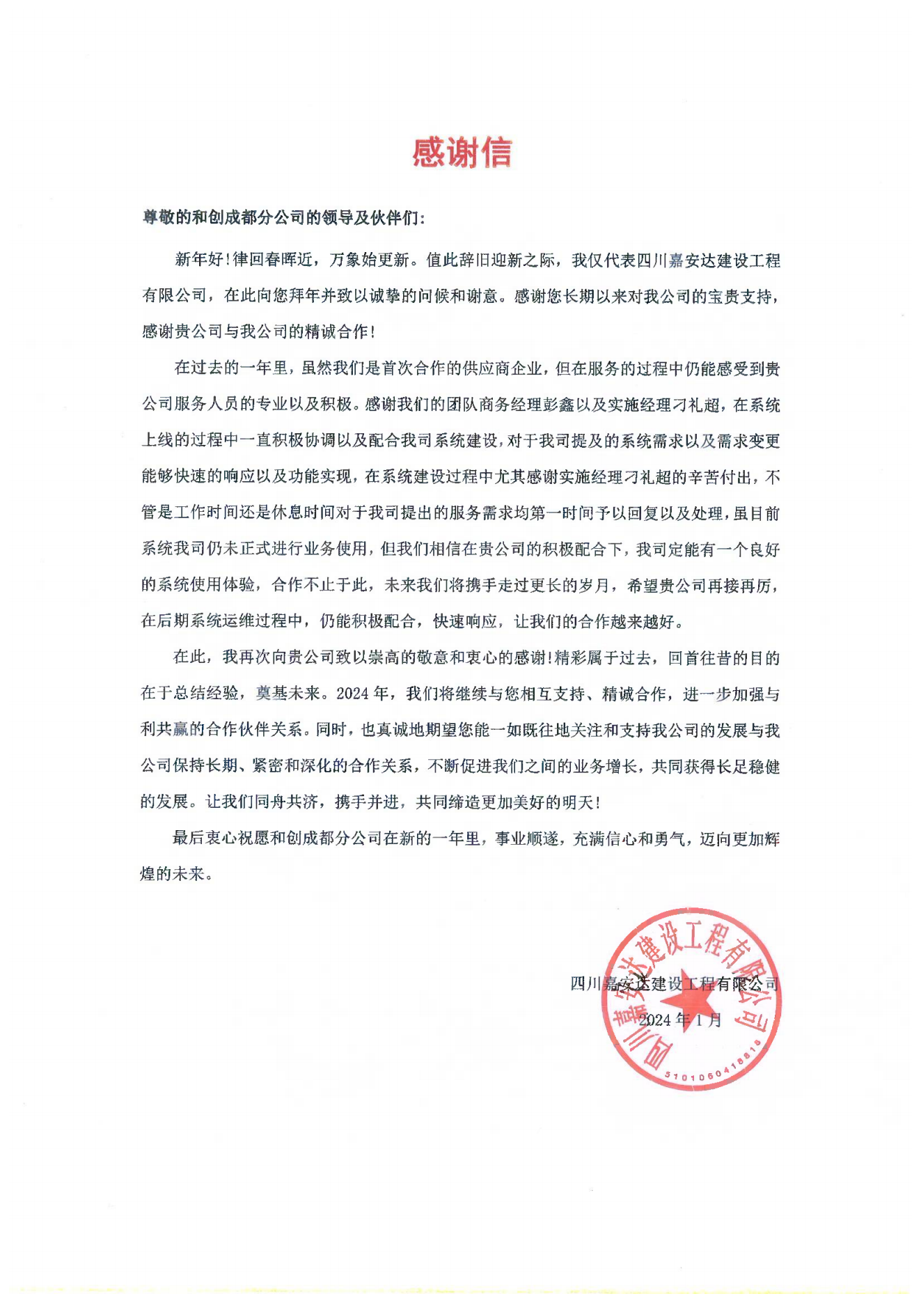 近日,紅圈團隊收到了來自四川嘉安達建設(shè)工程有限公司發(fā)來的感謝信。