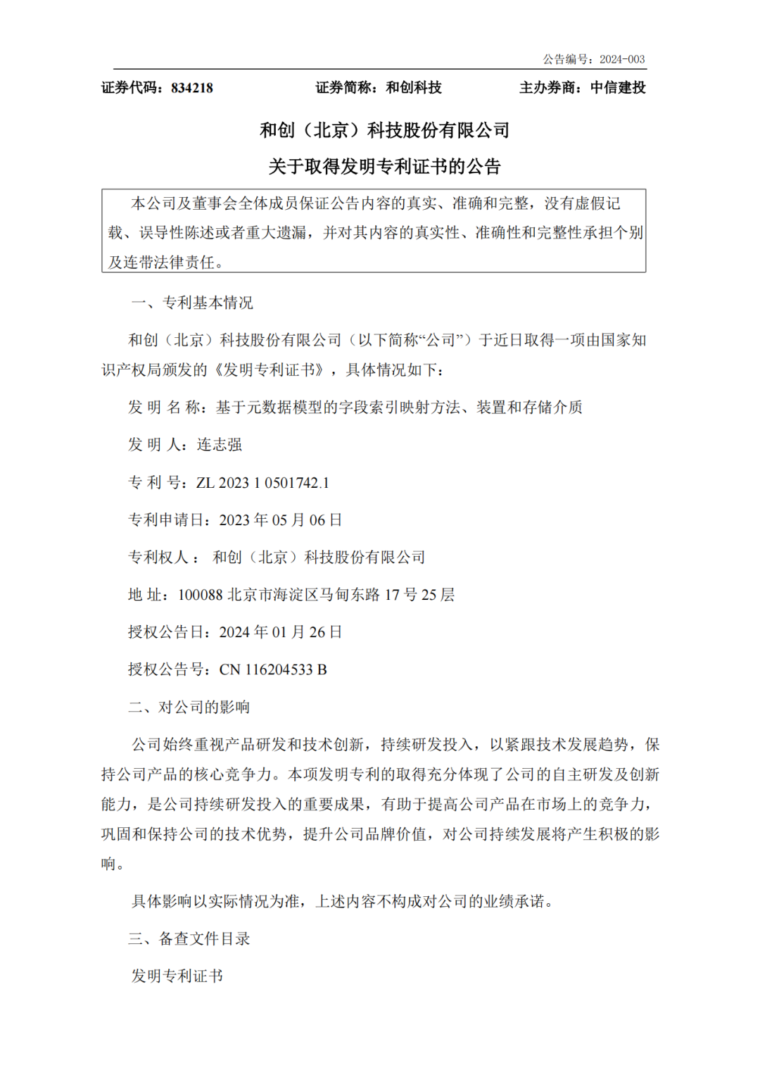 繼2023年連續獲得三項最新發明專利后,近日,和創(北京)科技股份有限公司又取得了2024年的第一項由國家知識產權局頒發的《發明專利證書》,發明名稱為:基于元數據模型的字段索引映射方法、裝置和存儲介質