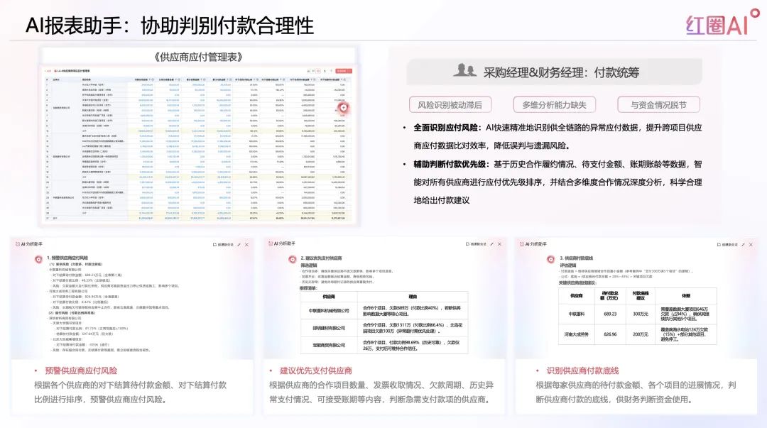 針對(duì)這一問題,紅圈AI報(bào)表助手通過智能化的數(shù)據(jù)分析,幫助企業(yè)高效生成實(shí)時(shí)、精準(zhǔn)的經(jīng)營(yíng)數(shù)據(jù)報(bào)表,并及時(shí)發(fā)現(xiàn)異常數(shù)據(jù),為決策者提供強(qiáng)有力的支持。