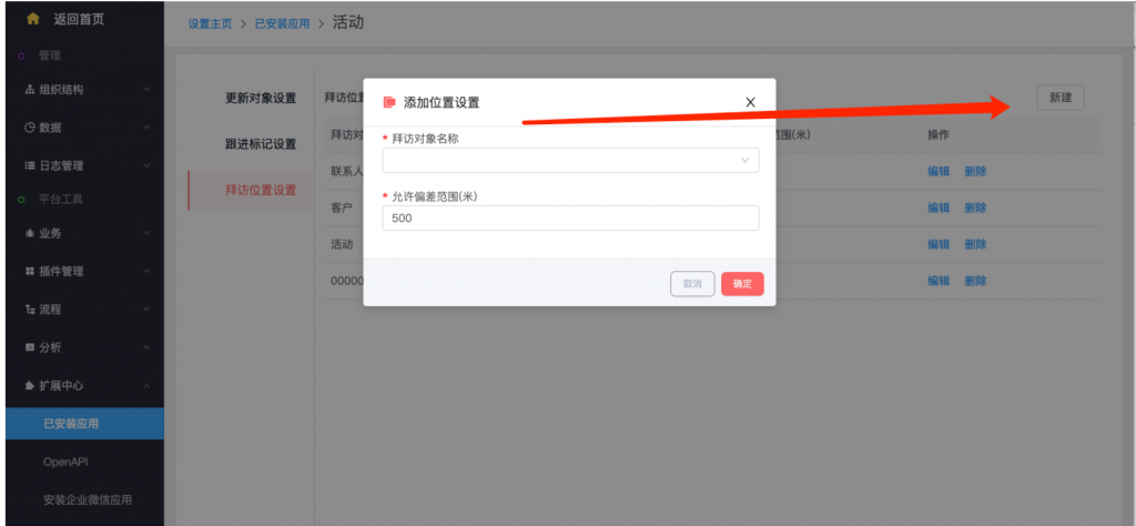 - 系統設置——擴展中心——已安裝應用——活動,增加了“拜訪位置設置”。新建拜訪位置設置,選擇拜訪對象、設置參考字段并設置允許偏差范圍