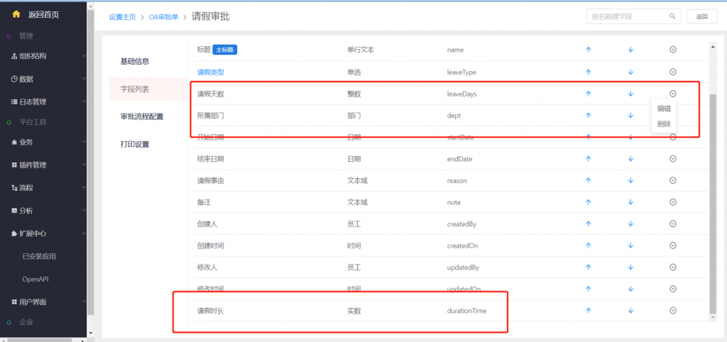 OA審批單—請假審批中默認增加實數類型的“請假時長”字段;原“請假天數”改為可刪除