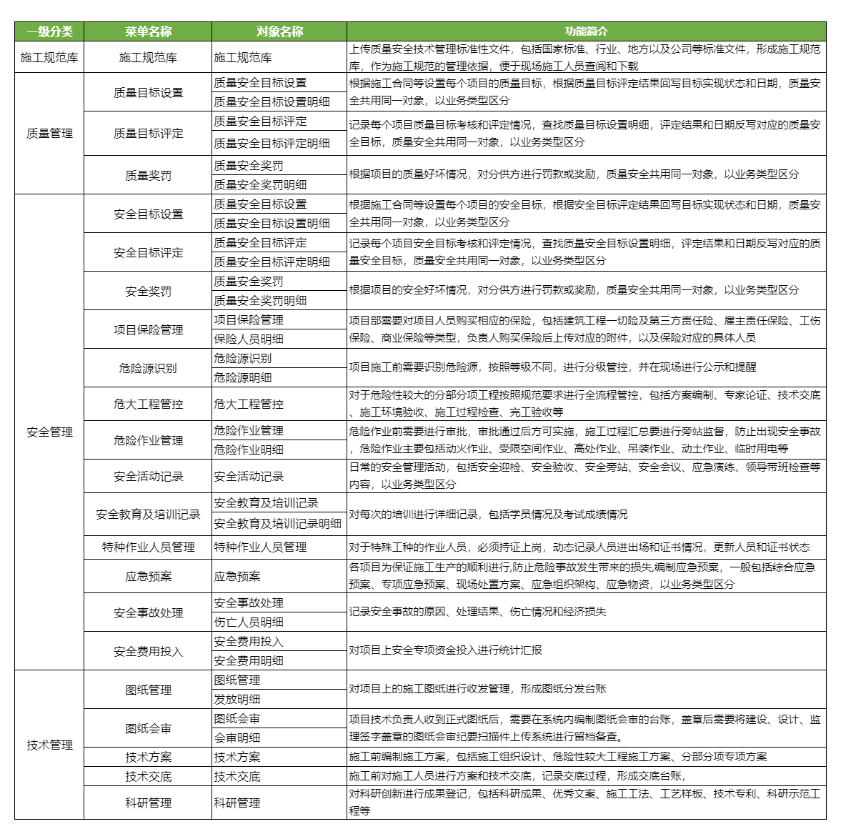 ● 工管理內(nèi)容主要針對(duì)大型總包項(xiàng)目施工現(xiàn)場(chǎng)業(yè)務(wù)管理,主要包括質(zhì)量、安全、技術(shù)管理,通過(guò)競(jìng)品分析和客戶(hù)業(yè)務(wù)分析,梳理出通用性較強(qiáng)、使用較多的功能點(diǎn),滿(mǎn)足客戶(hù)對(duì)現(xiàn)場(chǎng)施工管理需求。