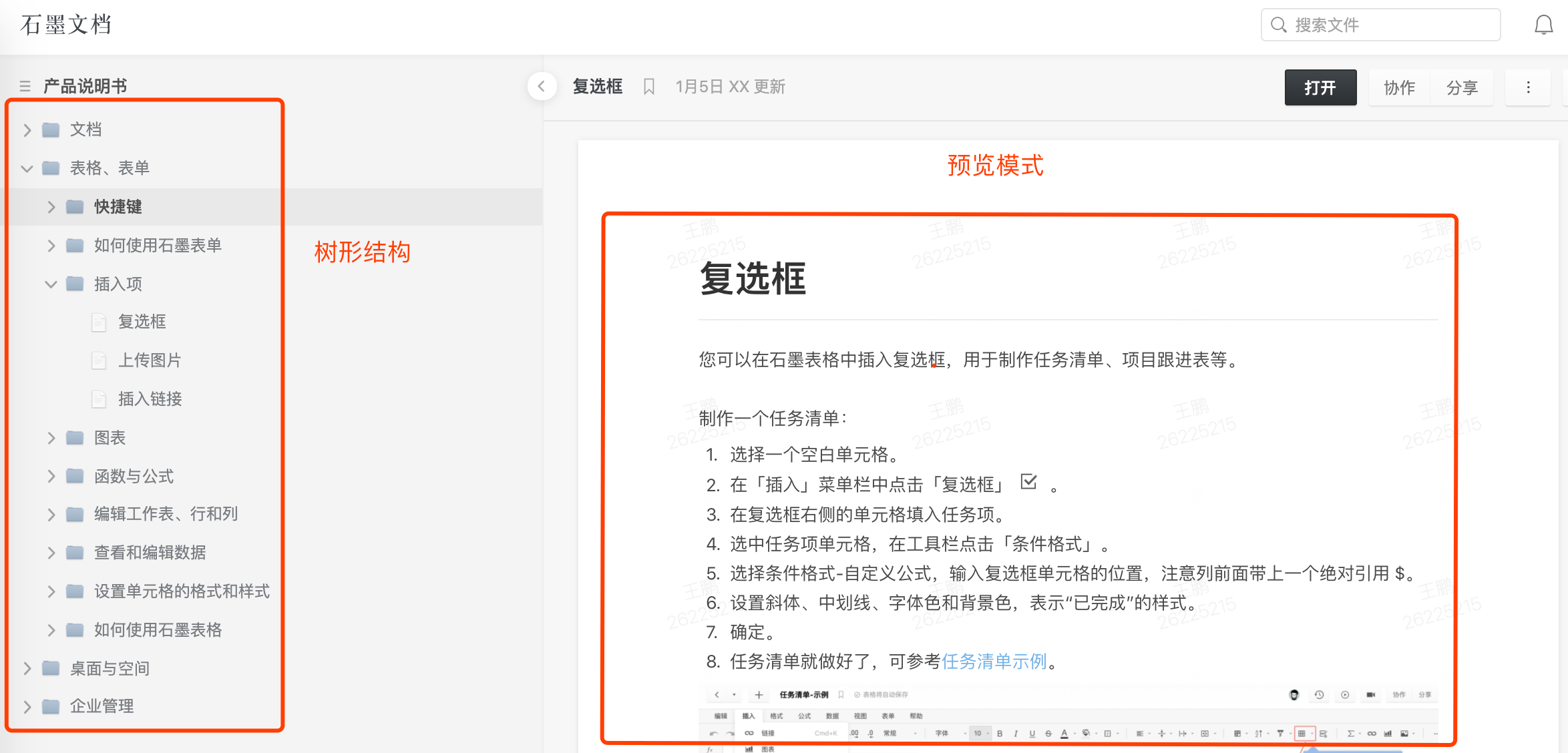 石墨的樹形結構還提供預覽模式,用戶可直接在左側的空間目錄點擊文件夾或文件,右側實時預覽,查看文件內容。