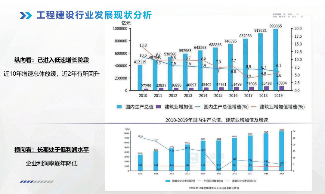 據(jù)國家統(tǒng)計局?jǐn)?shù)據(jù)顯示,2019年全國國內(nèi)生產(chǎn)總值為990,865億元,按可比價格計算,比上年增長6.1%,增速下降了0.6個百分點,建筑業(yè)增加值比上年增長5.6%,從最近十年建筑業(yè)增加值增速趨勢可以看出總體放緩的態(tài)勢。