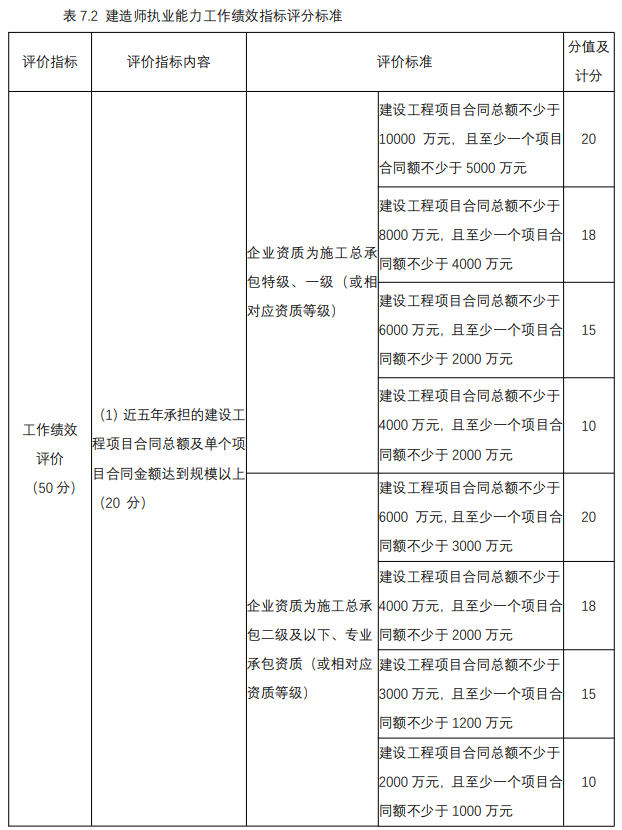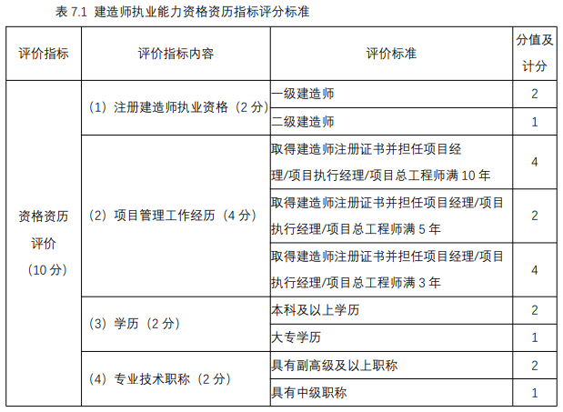 建造師執(zhí)業(yè)能力資格資歷指標按下表中的標準評分。