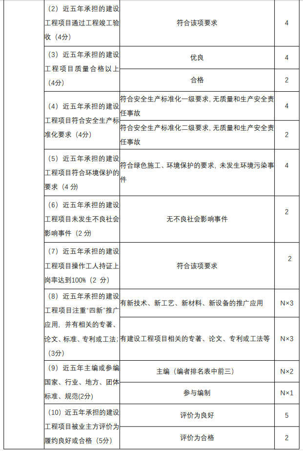 近五年完成的工作績效評價指標內容包括:①合同總額及單項合同金額達到規(guī)模以上;②通過工程竣工驗收;③工程質量合格以上;④符合安全生產標準化要求;⑤符合環(huán)境保護的要求;⑥未發(fā)生不良社會影響事件;⑦ 操作工人持證上崗率達到 100%;⑧注重“四新”推廣應用,并有相關的專著、論文、標準、專利或工法;⑨主編或參編國家、行業(yè)、地方、團體標準或規(guī)范;⑩被業(yè)主方評價為履約良好。
