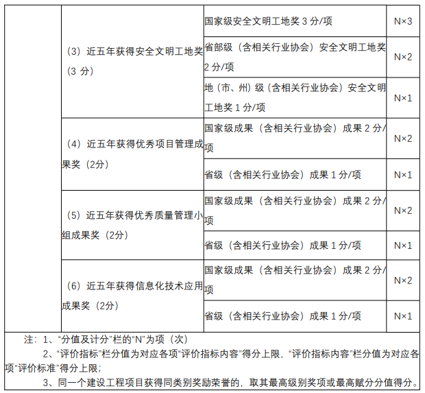 建造師執(zhí)業(yè)能力榮譽獎勵指標按表中的標準評分。