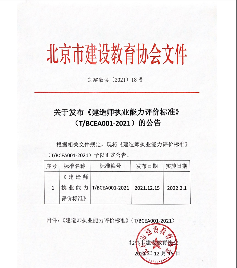 2021年12月15日,北京市建設教育協(xié)會發(fā)布了《建造師執(zhí)業(yè)能力評價標準》(T/BCEA001-2021)公告。該標準將在2022年2月1日起開始實施。 標準可作為管理機構、用人單位對建造師管理及聘用的依據,并可作為建造師行業(yè)能力發(fā)展標準的指引,助力工程建筑企業(yè)進行數字化轉型升級。