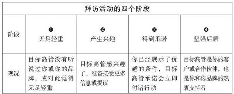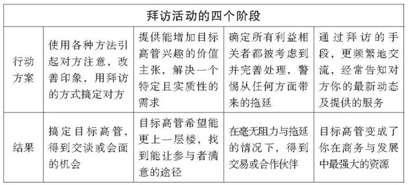 一次拜訪活動結(jié)束后,它的回應(yīng)率、投資回報率、支出和收入數(shù)字,都可以告訴你活動是否成功。不過,據(jù)我發(fā)現(xiàn),在活動進行過程中,歸類分析每一位目標(biāo)客戶,然后跟蹤他們的變動順序,總是能幫助你取得最好的結(jié)果。這就是下面我們分析“四個拜訪階段”的用意:幫助你為每一次拜訪活動準(zhǔn)備一套標(biāo)準(zhǔn)的評估系統(tǒng),因地制宜地實施必要的行動,從而最大限度地提高營銷活動的成功率。