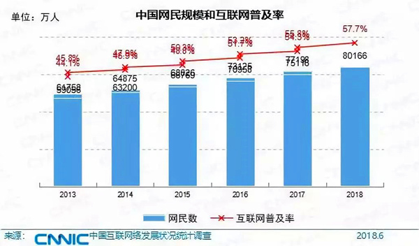 截至2018年6月,我國網(wǎng)民規(guī)模為8.02億,上半年新增網(wǎng)民2968萬人,較2017年末增加3.8%,互聯(lián)網(wǎng)普及率達(dá)57.7%。