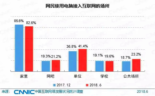 同樣,我國網(wǎng)民在家里通過電腦接入互聯(lián)網(wǎng)的比例為82.6%,與2017年末相比降低了3.0個百分點;在網(wǎng)吧、單位、學(xué)校、公共場所通過電腦接入互聯(lián)網(wǎng)的比例分別增長了2.0、4.6、0.5、4.5個百分點。在上網(wǎng)時長方面,2018年6月,中國網(wǎng)民的人均周上網(wǎng)時長為27.7小時,相比2017年末提高0.7個小時。