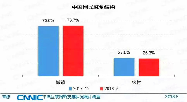 截至2018年6月,我國農(nóng)村網(wǎng)民占比為26.3%,規(guī)模為2.11億,較2017年末增加1.0%;城鎮(zhèn)網(wǎng)民占比73.7%,規(guī)模為5.91億,較2017年末增加4.9%。