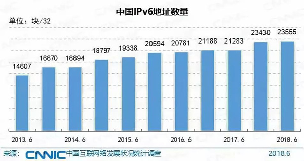 截至2018年6月,我國IPv6地址數(shù)量為23555塊/32,半年增長0.53%。