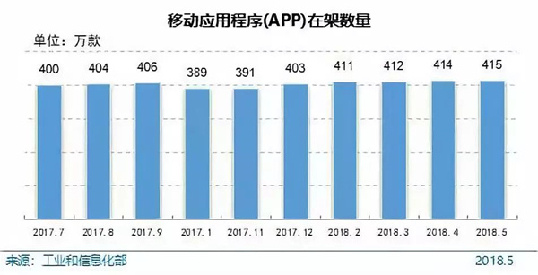 截至2018年5月,我國市場上監(jiān)測到的移動應(yīng)用程序(app)在架數(shù)量為415萬款。