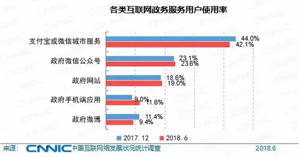截至2018年6月,我國在線政務(wù)服務(wù)用戶規(guī)模達(dá)到4.70億,占總體網(wǎng)民的58.6%,有42.1%的網(wǎng)民通過支付寶或微信城市服務(wù)平臺獲得政務(wù)服務(wù)。