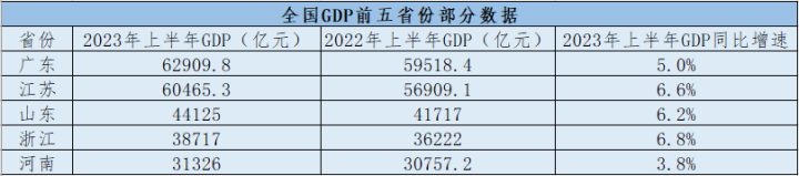 數據顯示,廣東GDP同比增長5.0%,雖然低于全國同期0.5個百分點,但GDP總量占到了全國的10.6%。如今,廣東GDP總量已經連續34年位居全國第一。江蘇今年上半年GDP增長6.6%,比一季度加快1.9個百分點,連續4個季度回升,體現出生產平穩、內需改善、質效提升、信心回暖的特征。山東表現也不俗,同比增長6.2%,高于全國0.7個百分點。