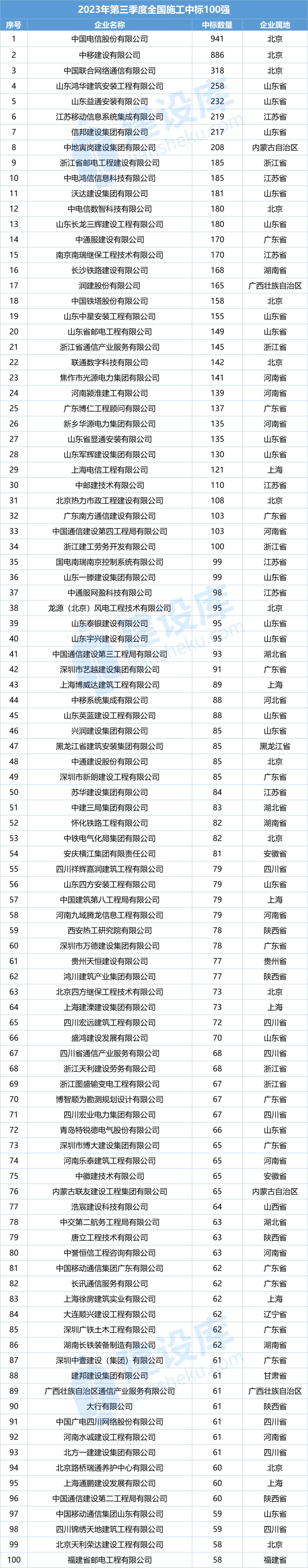 以下是建設(shè)庫(kù)大數(shù)據(jù)研究院統(tǒng)計(jì)的2023年第三季度全國(guó)施工中標(biāo)100強(qiáng)名單,快來(lái)看看你們的企業(yè)排名~
