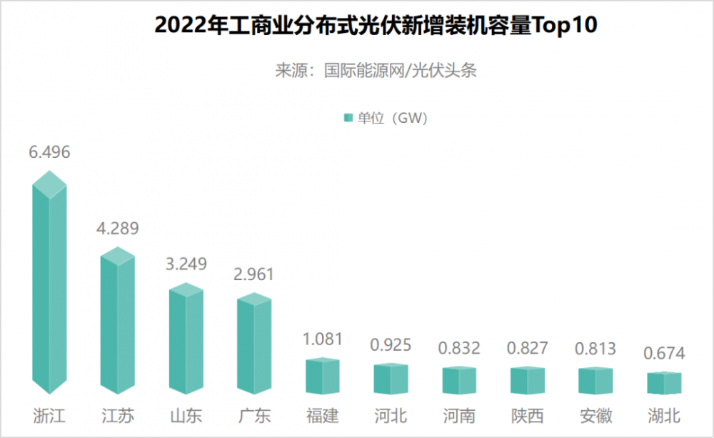 根據國家能源局數據,2022年分布式新增裝機容量排名前三的省份分別是河南省(7.75GW)、山東省(7.51GW)、浙江省(6.61GW)。其中,工商業分布式新增裝機容量排名前三的省份分別是浙江(6.496GW)、江蘇(4.289GW)、山東(3.249GW)。