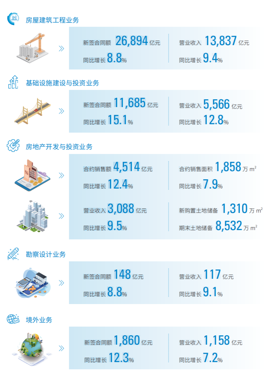 房建業務結構持續優化,新簽合同額26894億元,同比增長8.8%,營業收入13837億元,同比增長9.4%;