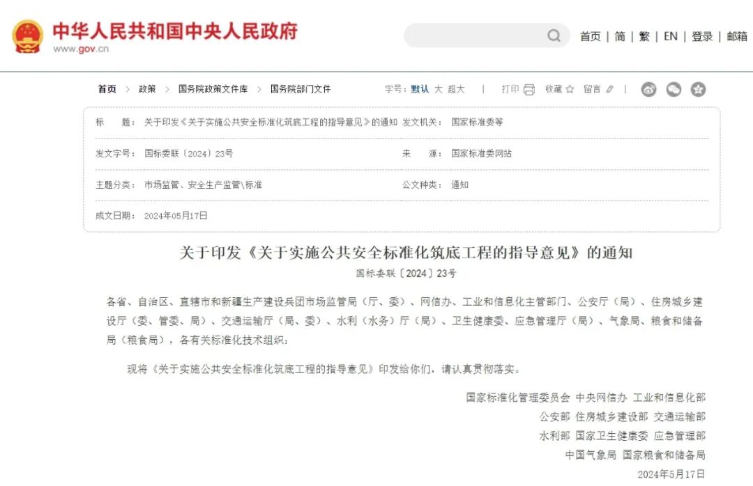 近日,住建部等十一部門聯合印發《關于實施公共安全標準化筑底工程的指導意見》(以下簡稱《指導意見》)。《指導意見》提出,到2027年,我國在社會治安、交通運輸、安全生產、消防救援、公共衛生、網絡和數據安全等15個重點領域制修訂公共安全國家和行業標準300項以上。