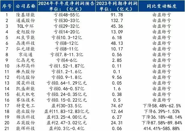 2024年上半年對于光伏行業的上市公司來說是一個充滿挑戰的時期,主要受到市場競爭加劇和光伏產品價格持續下跌的影響,導致多家企業業績出現顯著下滑或虧損。以下是部分光伏上市公司2024年上半年的業績情況概覽: