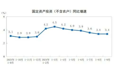 2024年1—9月份,全國固定資產投資(不含農戶)378978億元,同比增長3.4%。其中,民間固定資產投資191001億元,下降0.2%。從環比看,9月份固定資產投資(不含農戶)增長0.65%。