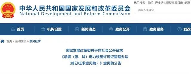 國家發(fā)展改革委關(guān)于向社會公開征求《承裝(修、試)電力設(shè)施許可證管理辦法(修訂征求意見稿)》意見的公告