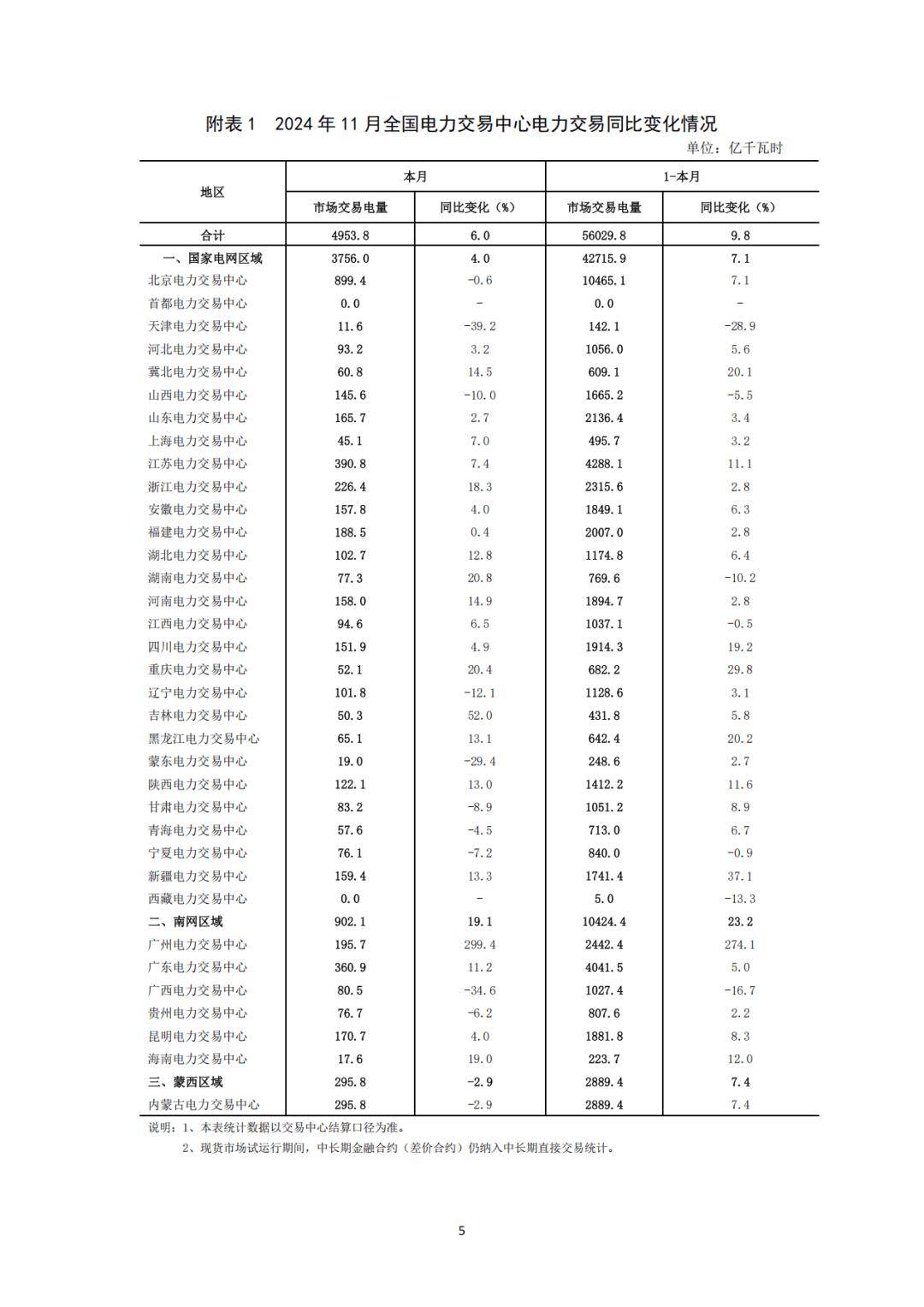 分區域來看,1-11月,國家電網區域各電力交易中心累計組織完成市場交易電量42715.9億千瓦時,同比增長7.1%,其中北京電力交易中心組織完成省間交易電量合計為10465.1億千瓦時;南方電網區域各電力交易中心累計組織完成市場交易電量10424.4億千瓦時,同比增長23.2%,其中廣州電力交易中心組織完成省間交易電量合計為2442.4億千瓦時;內蒙古電力交易中心累計組織完成市場交易電量2889.4億千瓦時,同比增長7.4%。