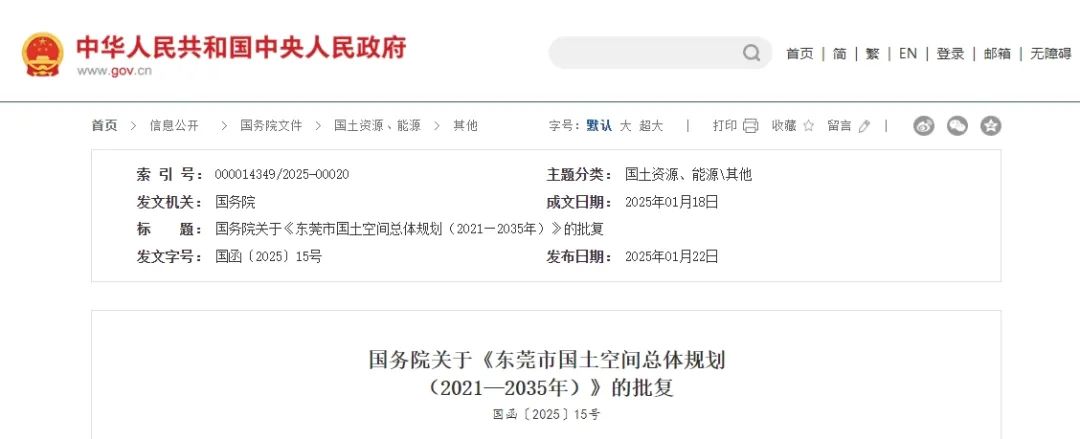 國務院關于《東莞市國土空間總體規劃(2021—2035年)》的批復