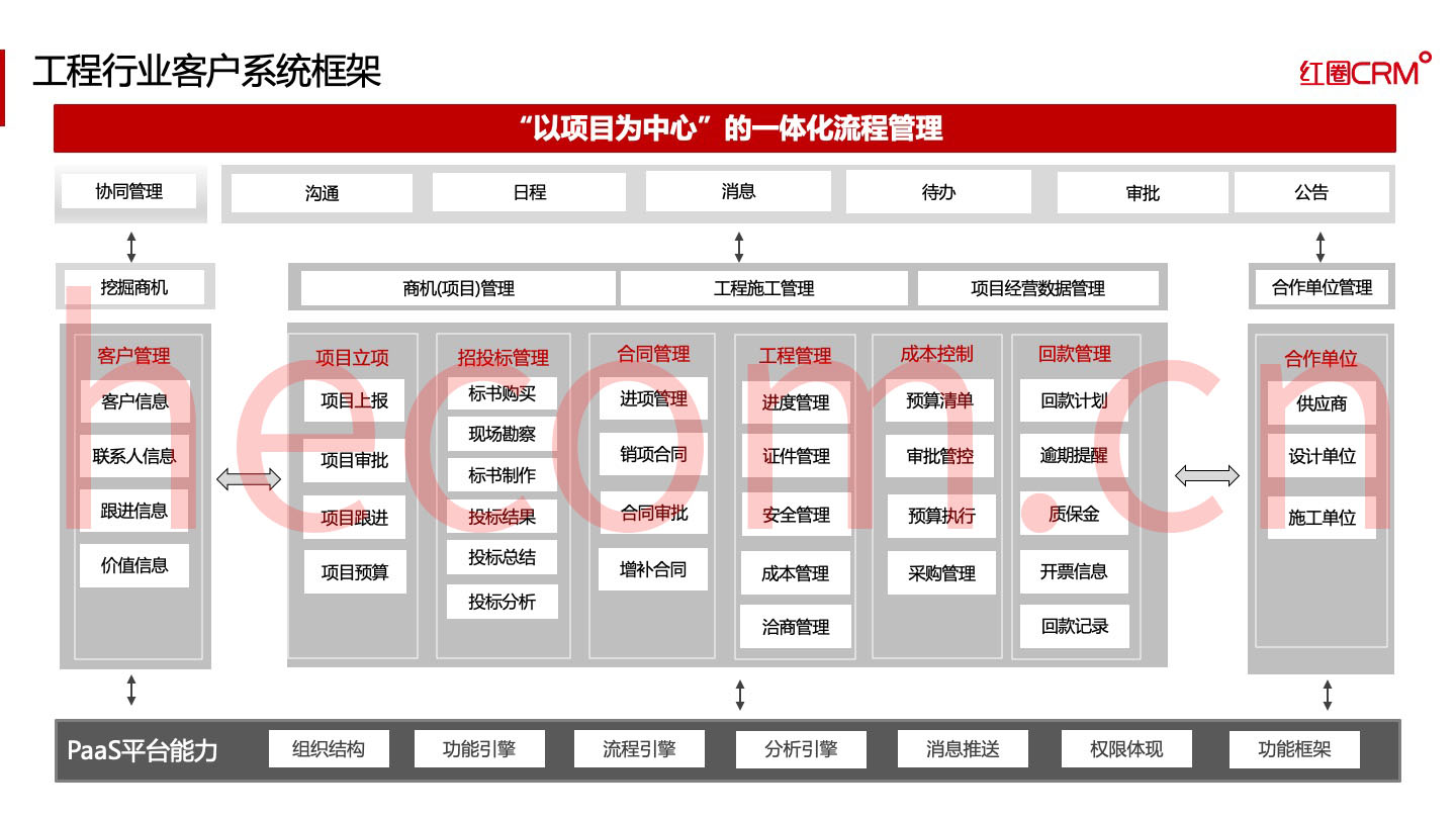 隨著市場經(jīng)濟(jì)的高速發(fā)展,企業(yè)間的競爭日趨激烈,深受政策影響的建筑工程企業(yè)也不例外,強(qiáng)化項目過程精細(xì)化管理,已經(jīng)成為建筑工程企業(yè)提升競爭力的重要途徑。紅圈借助互聯(lián)網(wǎng)、云計算、移動大數(shù)據(jù)等技術(shù),基于自主研發(fā)的紅圈 PaaS 平臺推出了紅圈 CRM 建筑工程項目管理系統(tǒng),幫助建筑工程企業(yè)進(jìn)行業(yè)務(wù)流程梳理,打造以項目為中心的移動管理平臺,從而助力建筑工程企業(yè)在日益激烈的競爭中處于領(lǐng)先優(yōu)勢。紅圈 CRM 建筑工程項目管理系統(tǒng)適用于房建工程、市政工程、地基工程、水利工程、園林工程、環(huán)保工程、電力工程、道路工程等行業(yè)企業(yè)。
